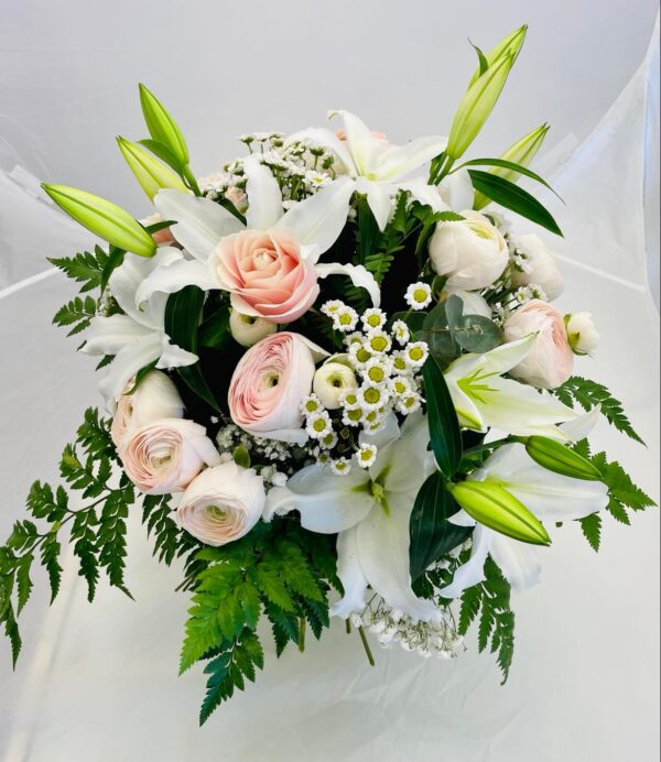 Bouquet di fiori bianchi e rosa e verdi decorativi